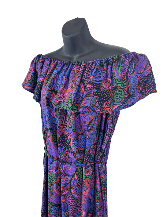 The Meg Off the Shoulder Ruffle Dress - Cool Colors Floral - XL