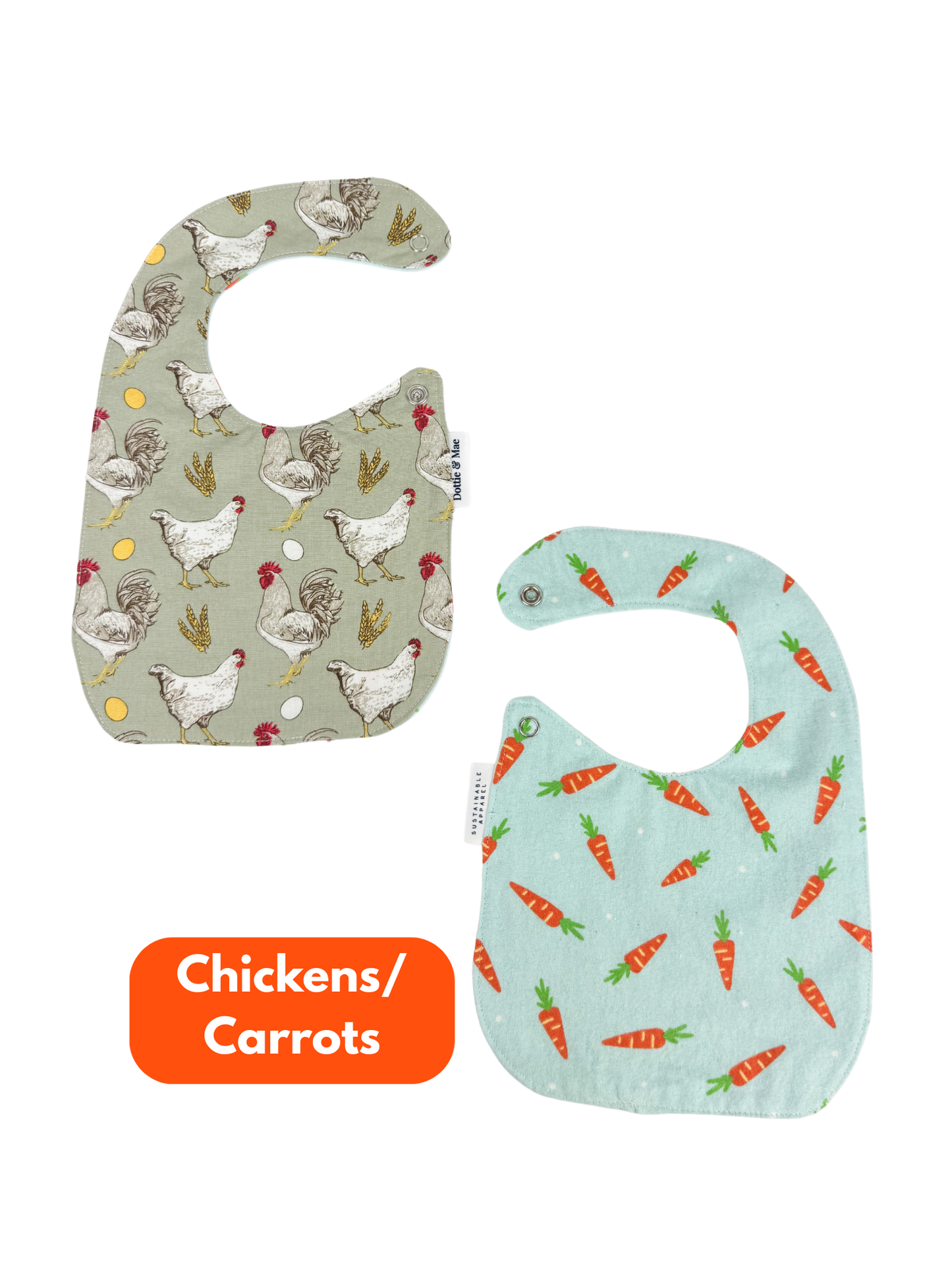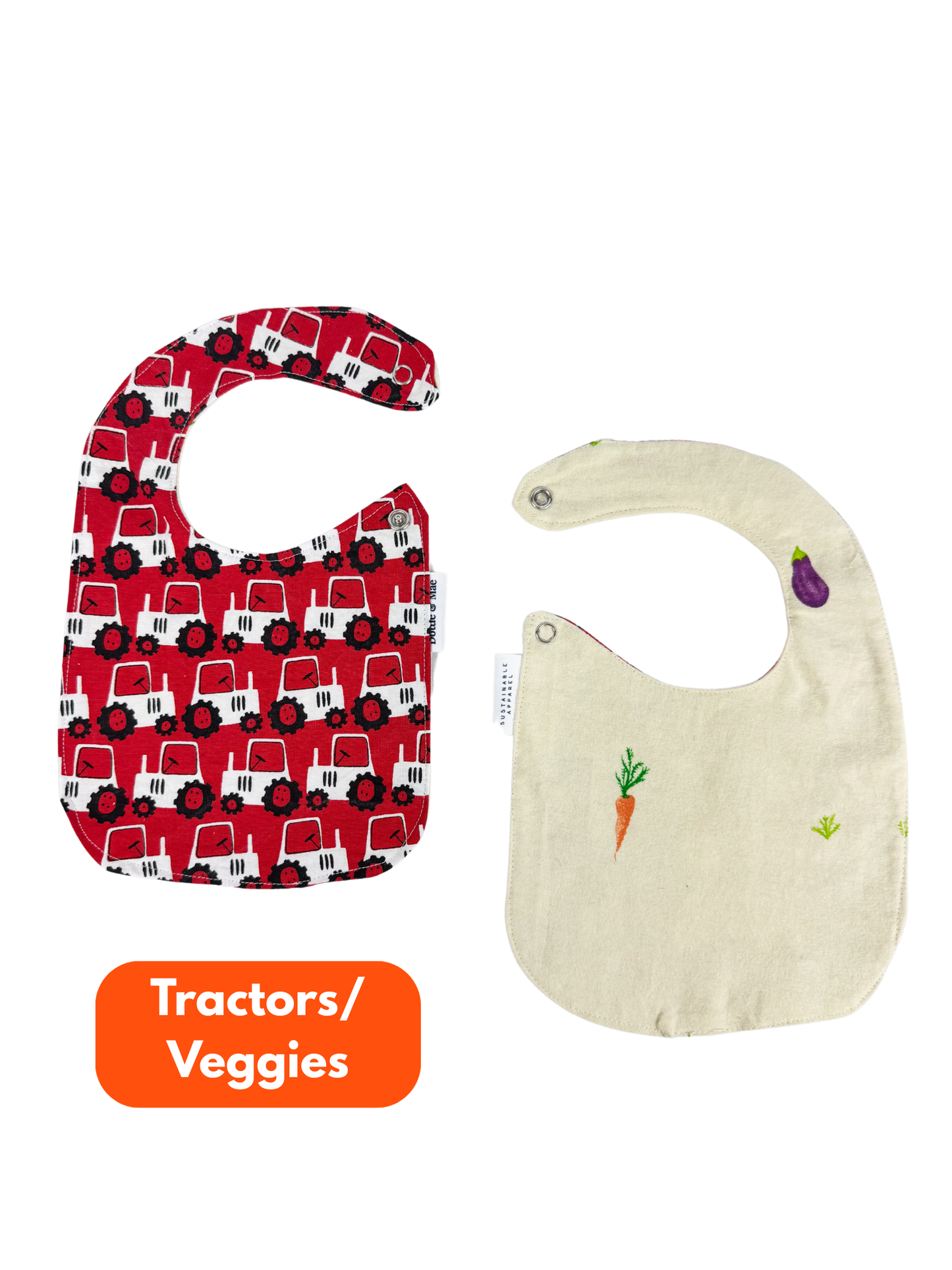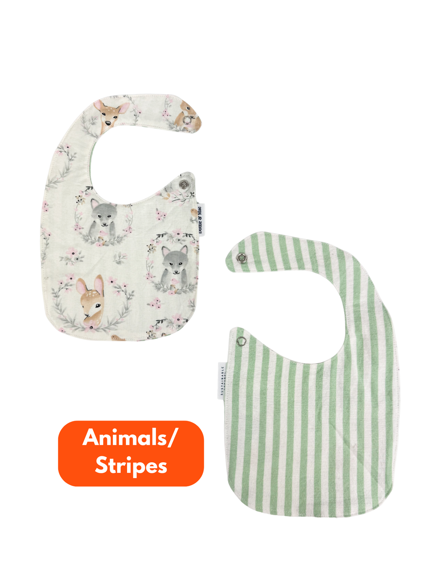 They are perfect to use as drool bibs to protect baby’s adorable outfits from all their drooling. The back is made from soft and absorbent cotton fabrics. Bibs can be worn either way for two looks in one!