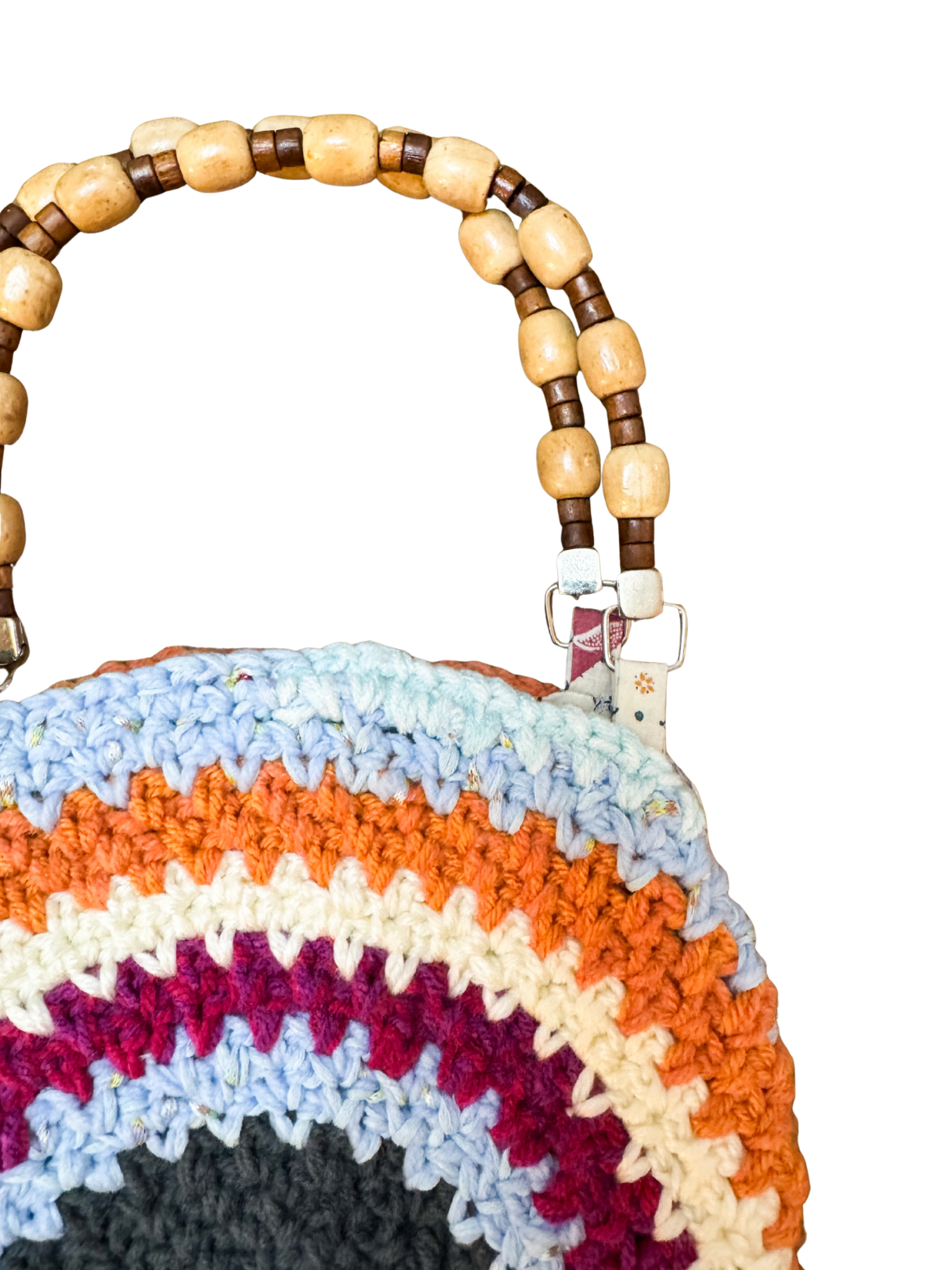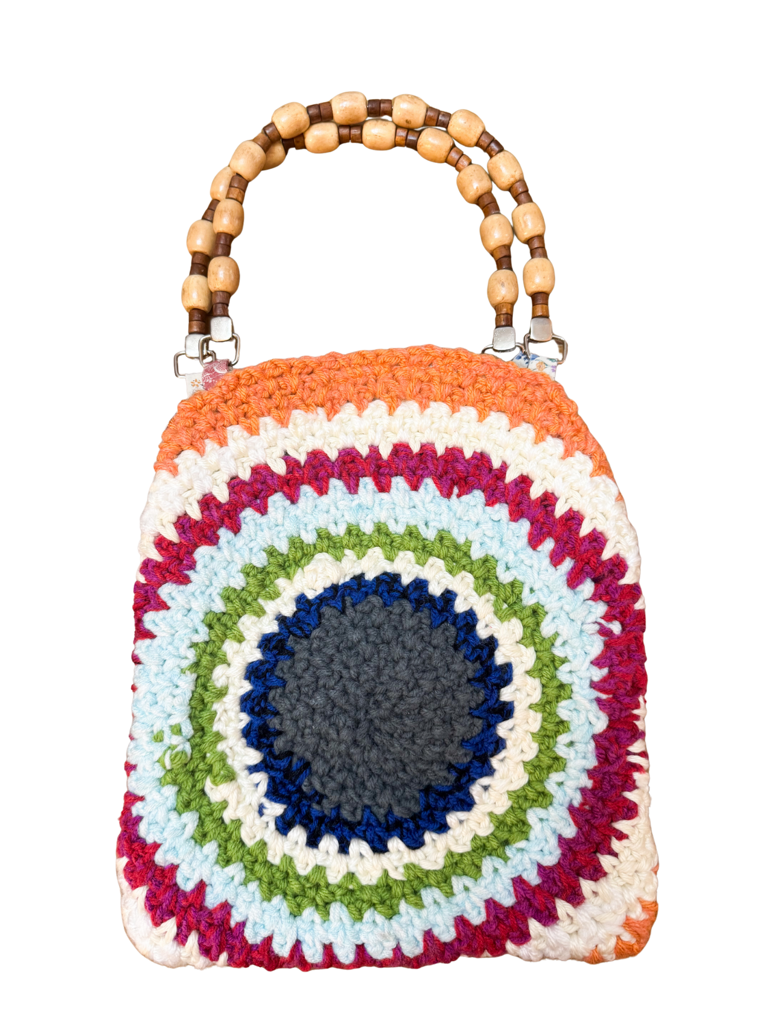 This crochet handbag is made from thrifted hand made crochet placemats and vintage beaded handles.